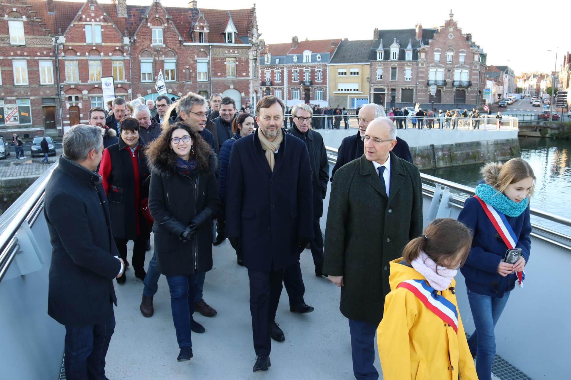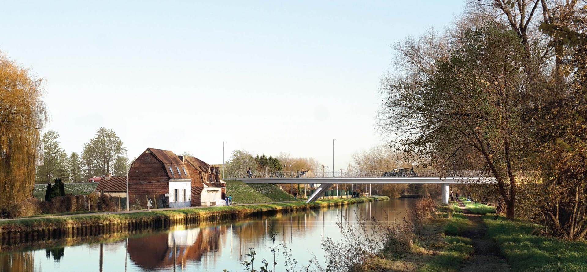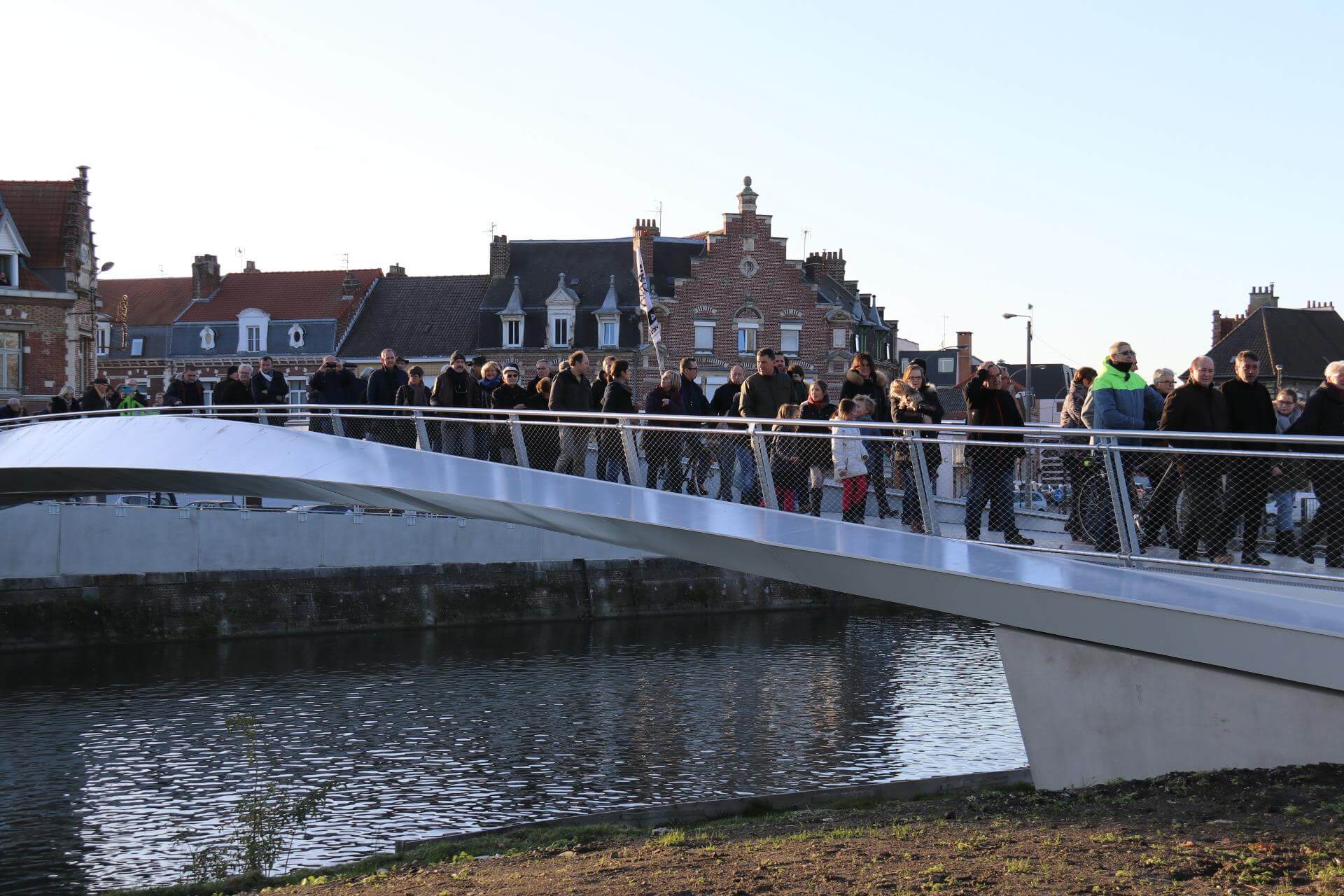 C’est un fil, un lien aérien, contemporain et léger entre les deux rives de l’Aa. La rive industrieuse et travailleuse d’un côté, la rive rêveuse et bucolique de l’autre. Inaugurée le samedi 25 novembre 2017, la passerelle piétonne et cycliste enjambe désormais le canal de Saint-Omer. Elle relie l’allée des Marronniers au quai du commerce, juste en bas de la rue de Dunkerque. François Decoster, président de la Communauté d’Agglomération du Pays de Saint-Omer, y voit : « un geste très important pour les circulations douces ».