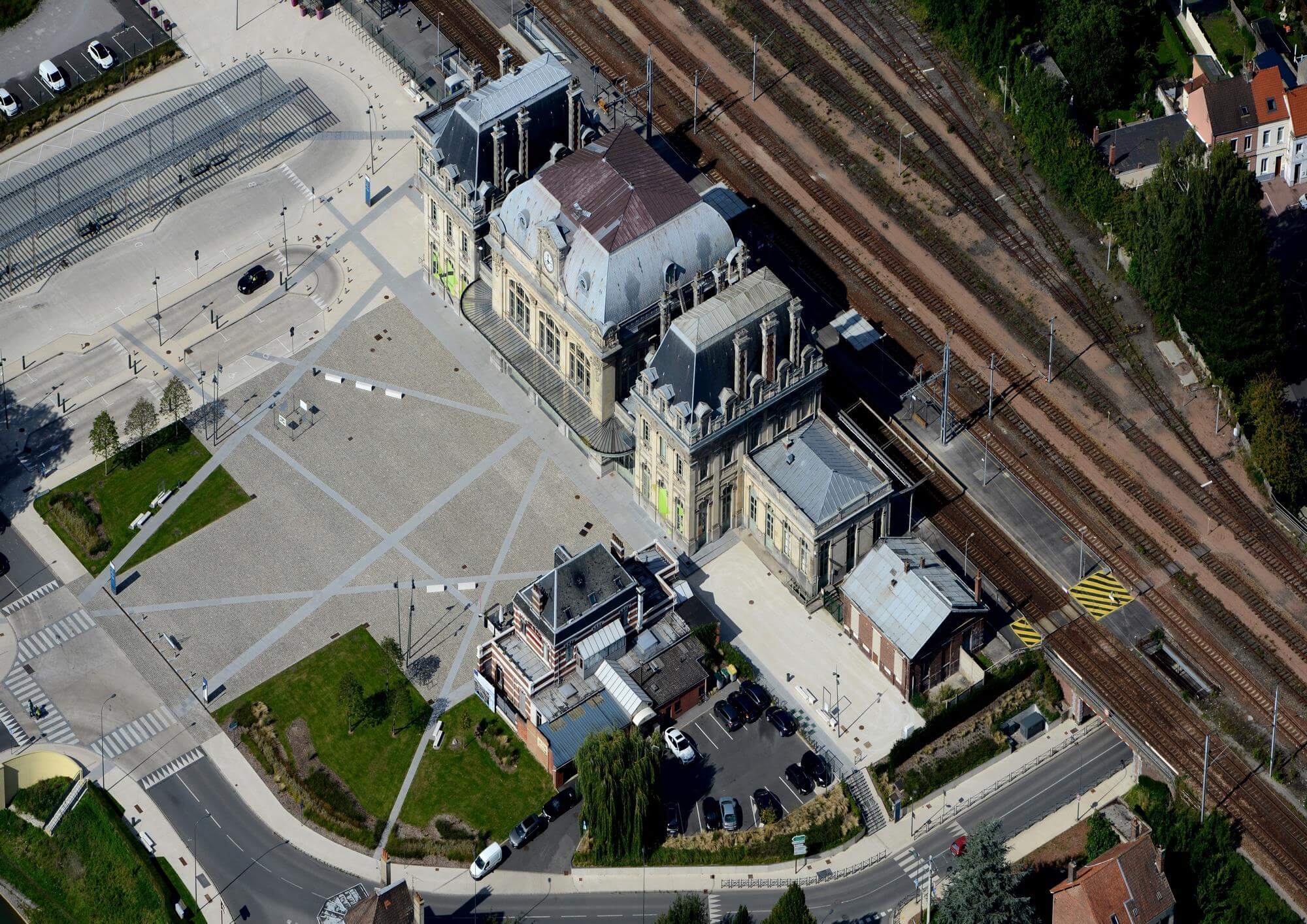 Un aménagement paysager et un pont font le lien avec la nouvelle gare au début du XXe siècle.