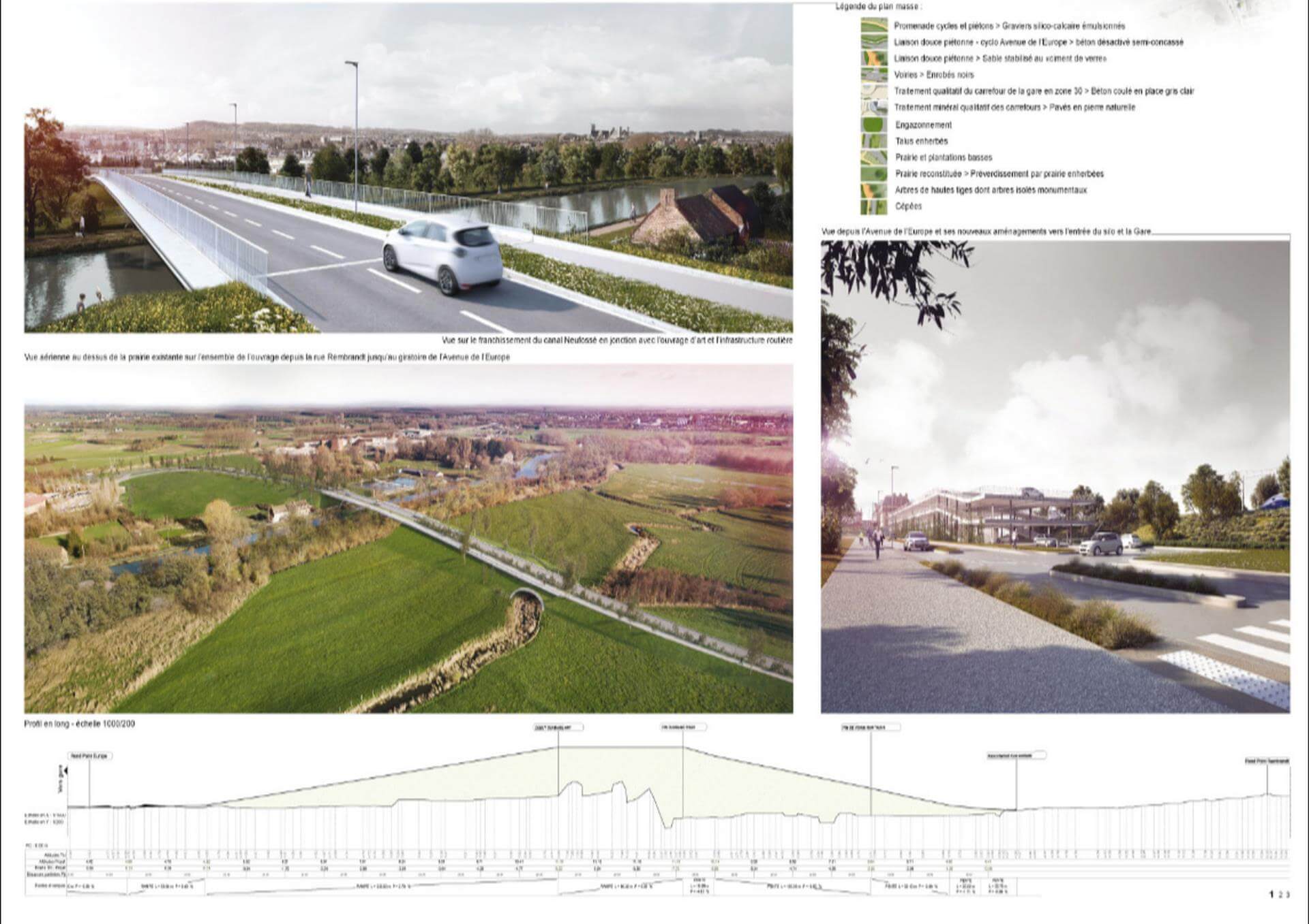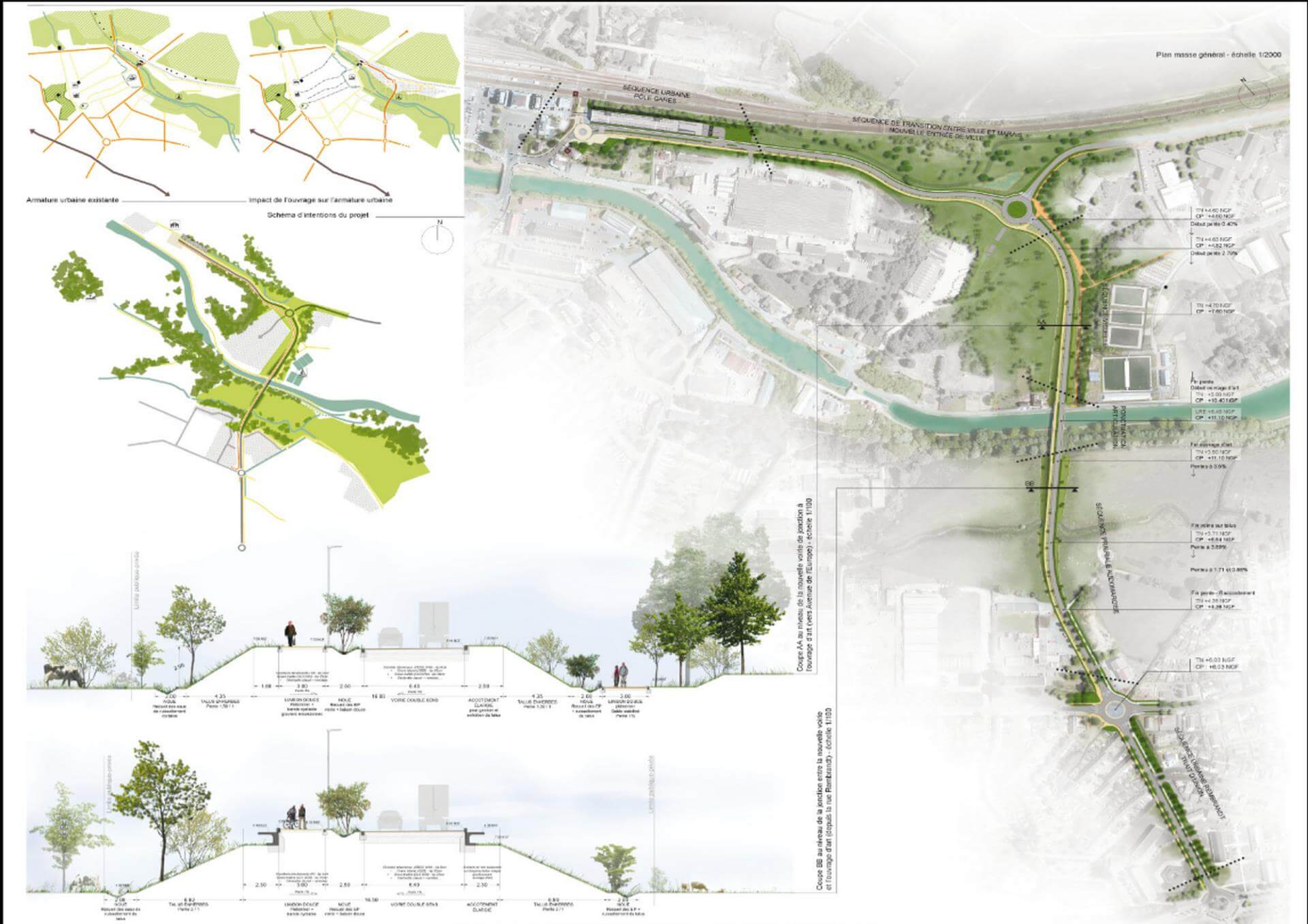 Ce quartier fait le lien entre la gare, le centre historique et les faubourgs. Grâce à la nouvelle passerelle piétonne et cyclable, il va devenir le trait d’union naturel des déplacements piétons et cyclistes entre ces trois pôles. Les surfaces foncières disponibles pourraient permettre, à terme, la création de 120 logements. La vocation économique traditionnelle du secteur sera retrouvée avec un potentiel de 10 000 m2 d’activités tertiaires entre la gare et le canal. Le développement d’un espace de logistique urbaine pourrait également être envisagé. Les véhicules accèderont au site par une voie interne laissant la berge aux modes doux. Des espaces verts publics ou privés traversant et perpendiculaires au canal feront le lien entre les deux. Le stationnement sur la rive droite sera localisé de manière privilégiée entre la future voirie et les espaces ferroviaires, mais aussi en rez-de-chaussée des bâtiments d’activités.